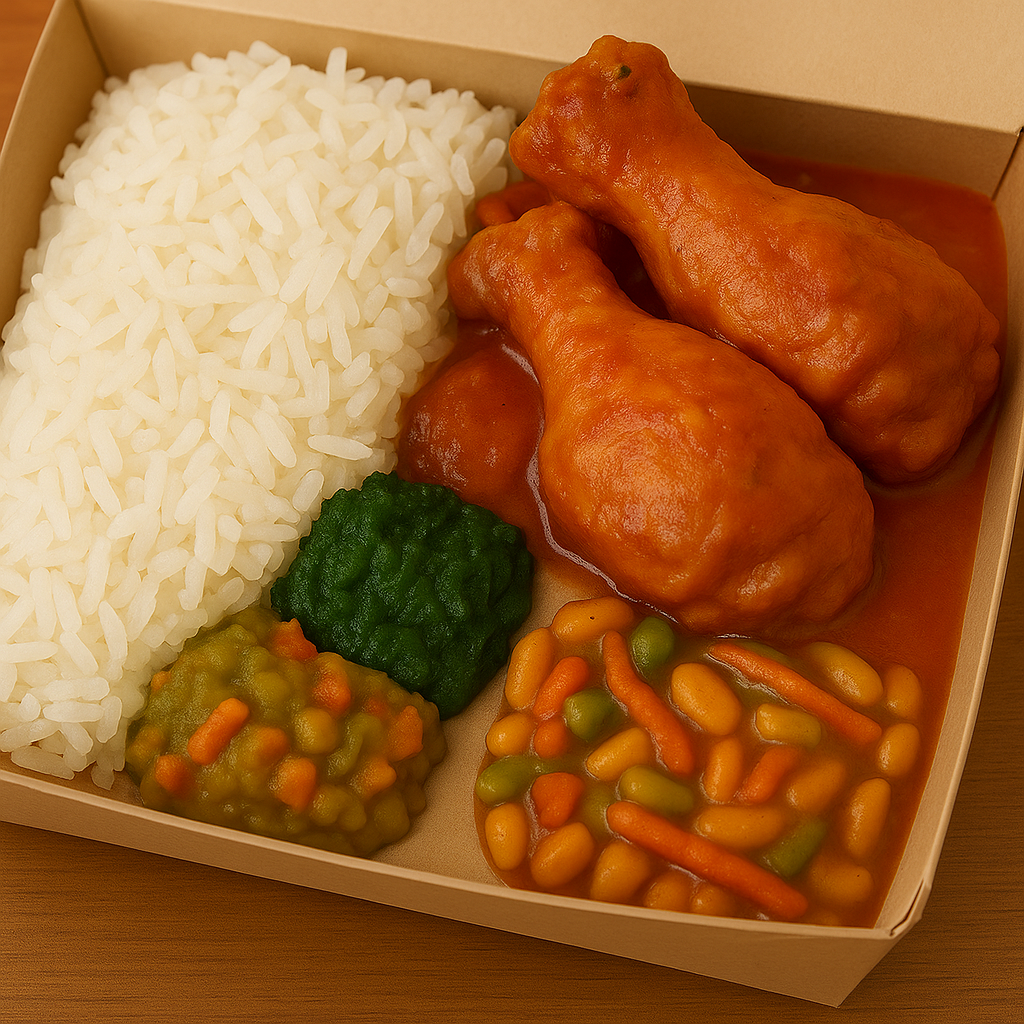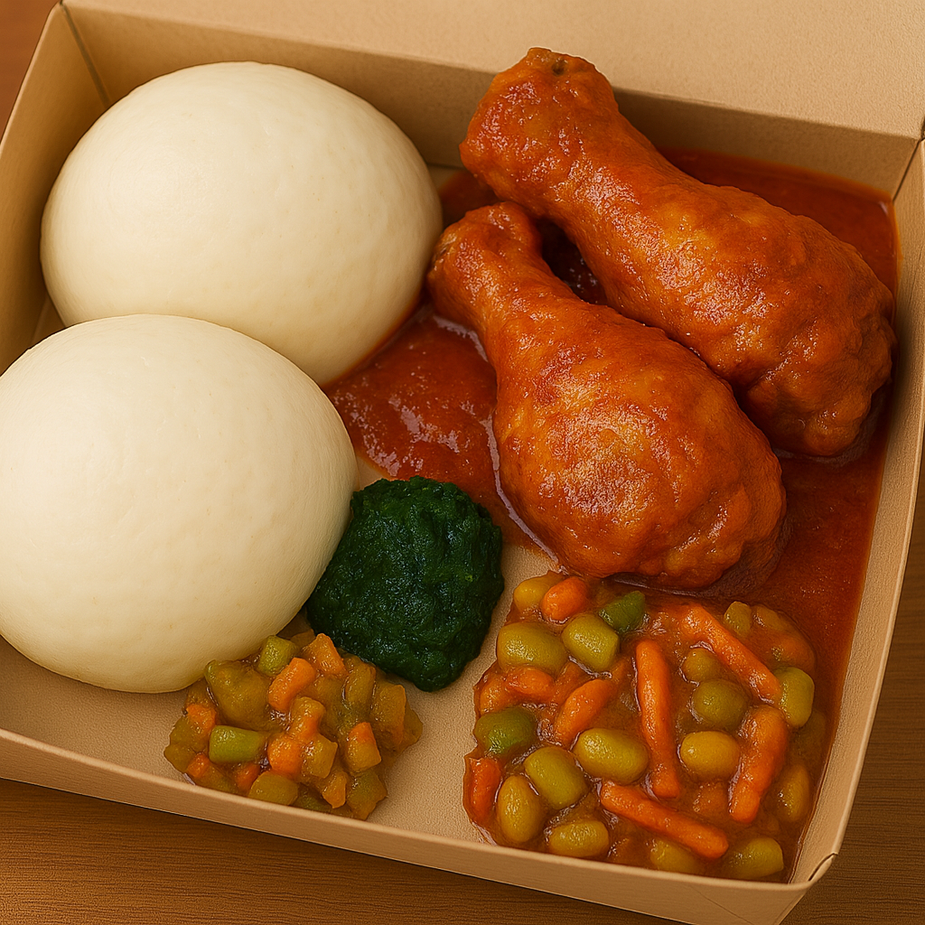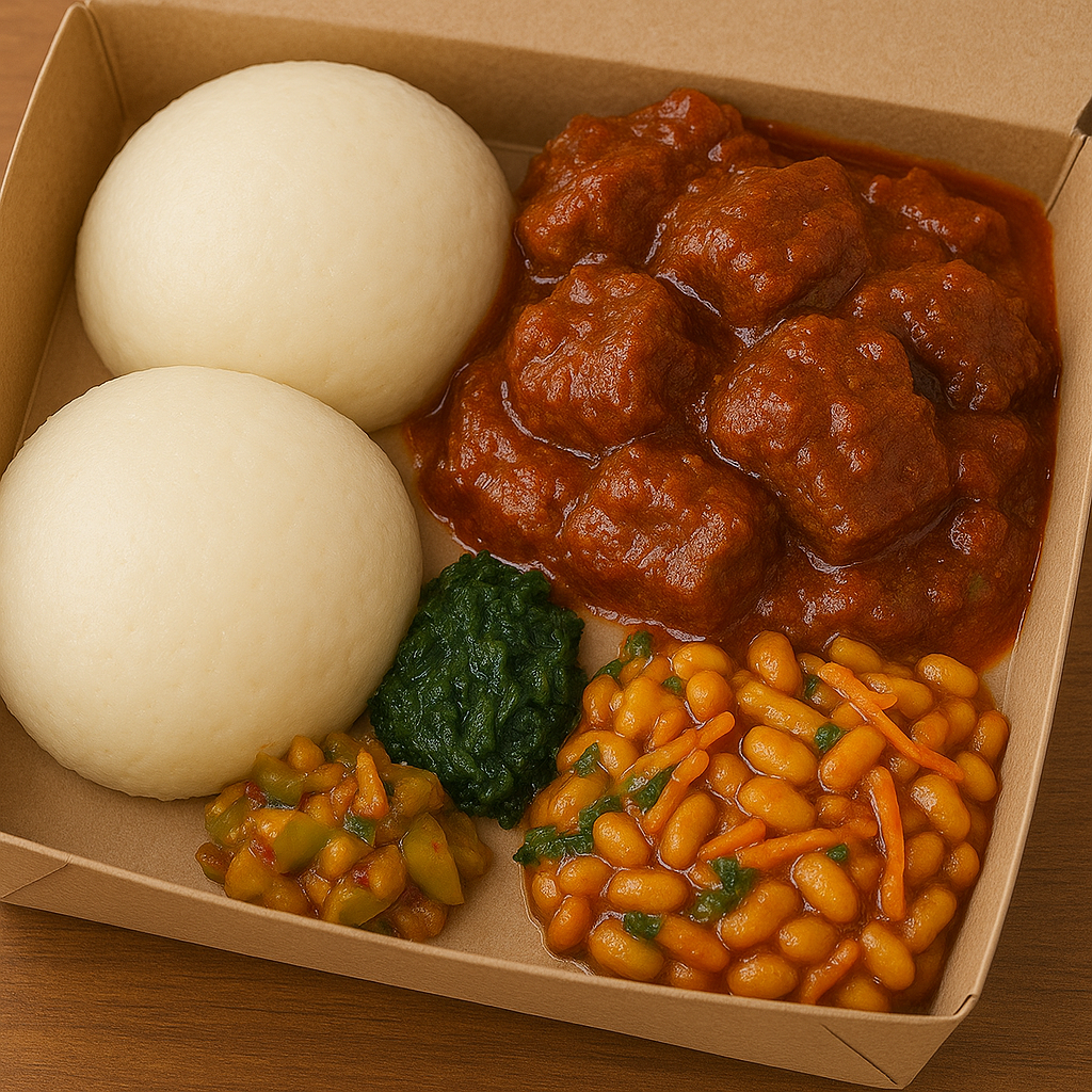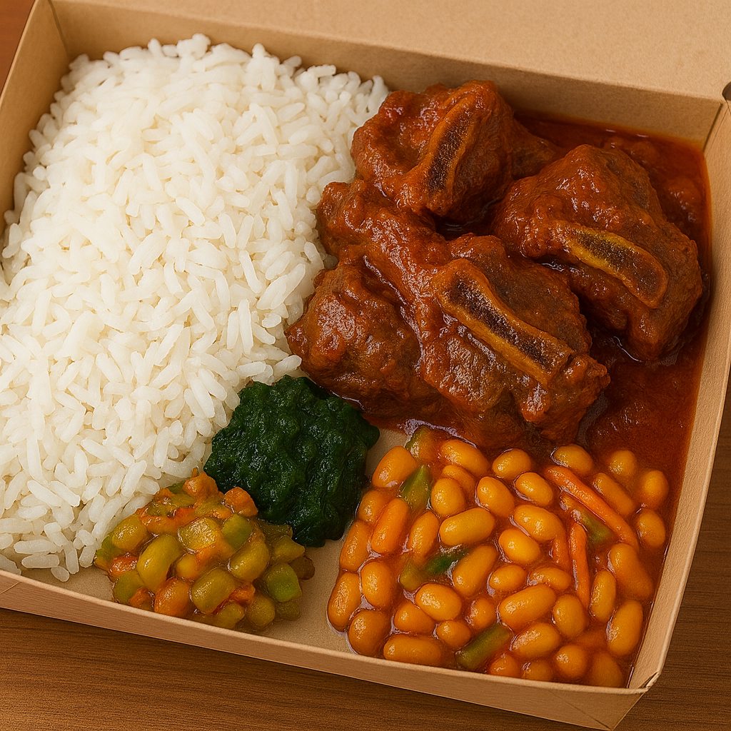 All plates come with spoon, fork, and Veg Trio (chakalaka, green veg, atchar).