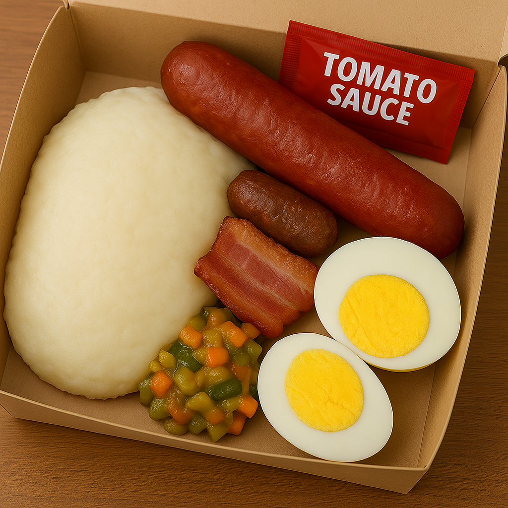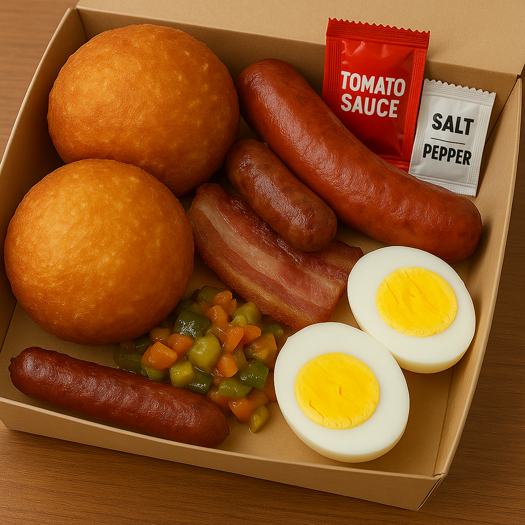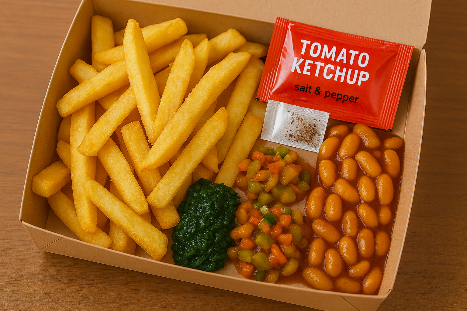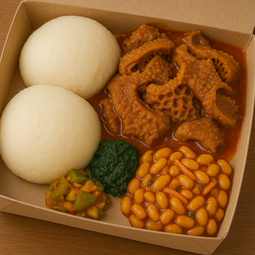 All plates come with spoon, fork, and Veg Trio (chakalaka, green veg, atchar).